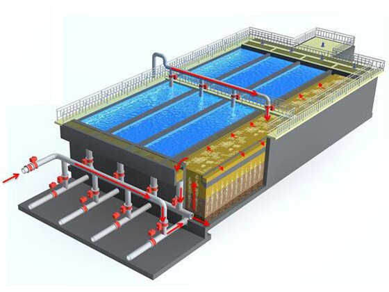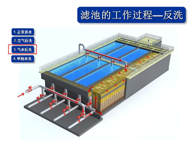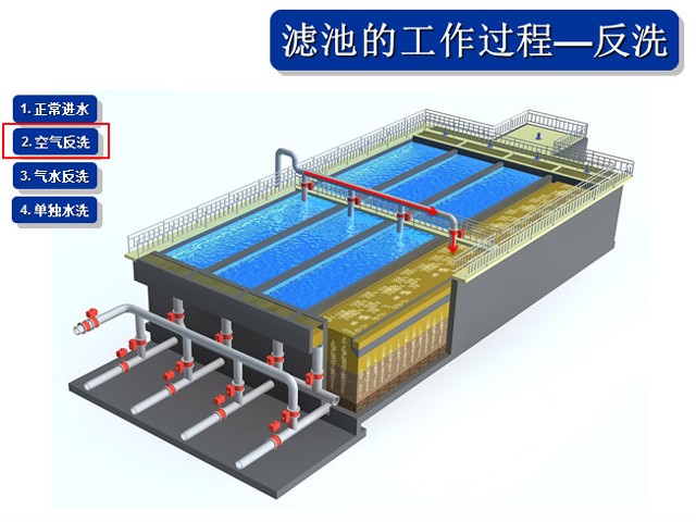 反洗风机:由罗茨鼓风机按设定的风量,通过整个滤池底盘输入反冲洗空气。