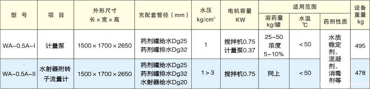 本公司生产的WA系列加药设备是专供投加水质稳定剂、混凝剂、消毒剂等多种性能的水处理药剂。