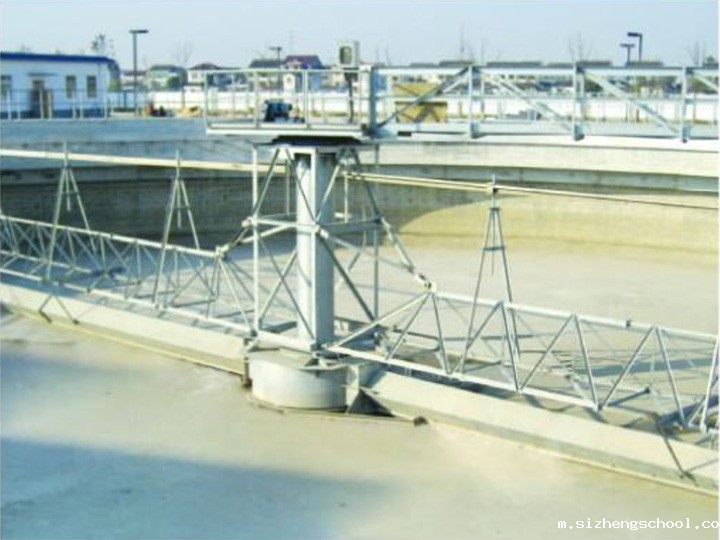 中心传动吸泥机主要由传动结构、中心竖架、吸泥架、刮泥架、刮泥板及撇渣机构等组成。污水从周边进入配水槽,经槽底配水孔均匀地流入沉淀池,在周边进水挡板的作用下,水流从池底部流向中心,并从上部返回四周的出水槽内。周边配水槽采用变断面配水孔不均匀分布设计,以保证周边配水的均匀性,驱动装置带动固定在桁架上的变径吸泥管沿池底缓慢旋转,由吸泥管上特殊设计的系列孔口以静水压力为动力将沉积在池底的污泥吸至吸泥管中,从排泥筒排出,浮渣刮板将沉淀池表面的浮渣刮至集渣斗,排出池外。