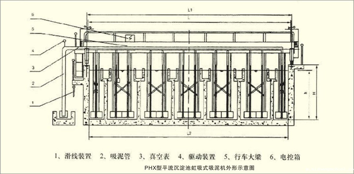 PHX型平流沉淀池虹吸式吸泥机是利用虹吸原理排泥,靠液下泵及水射器抽吸形成虹吸,吸泥机在导轨上往返行走,边行走,边吸泥。通过电控系统的指令,主梁两端的驱动机构同步驱动滚轮,带动池底集泥装置,集泥装置将污泥刮送于各吸泥口,在虹吸作用下连续排出池外。可依泥量的多少确定排泥的次数。